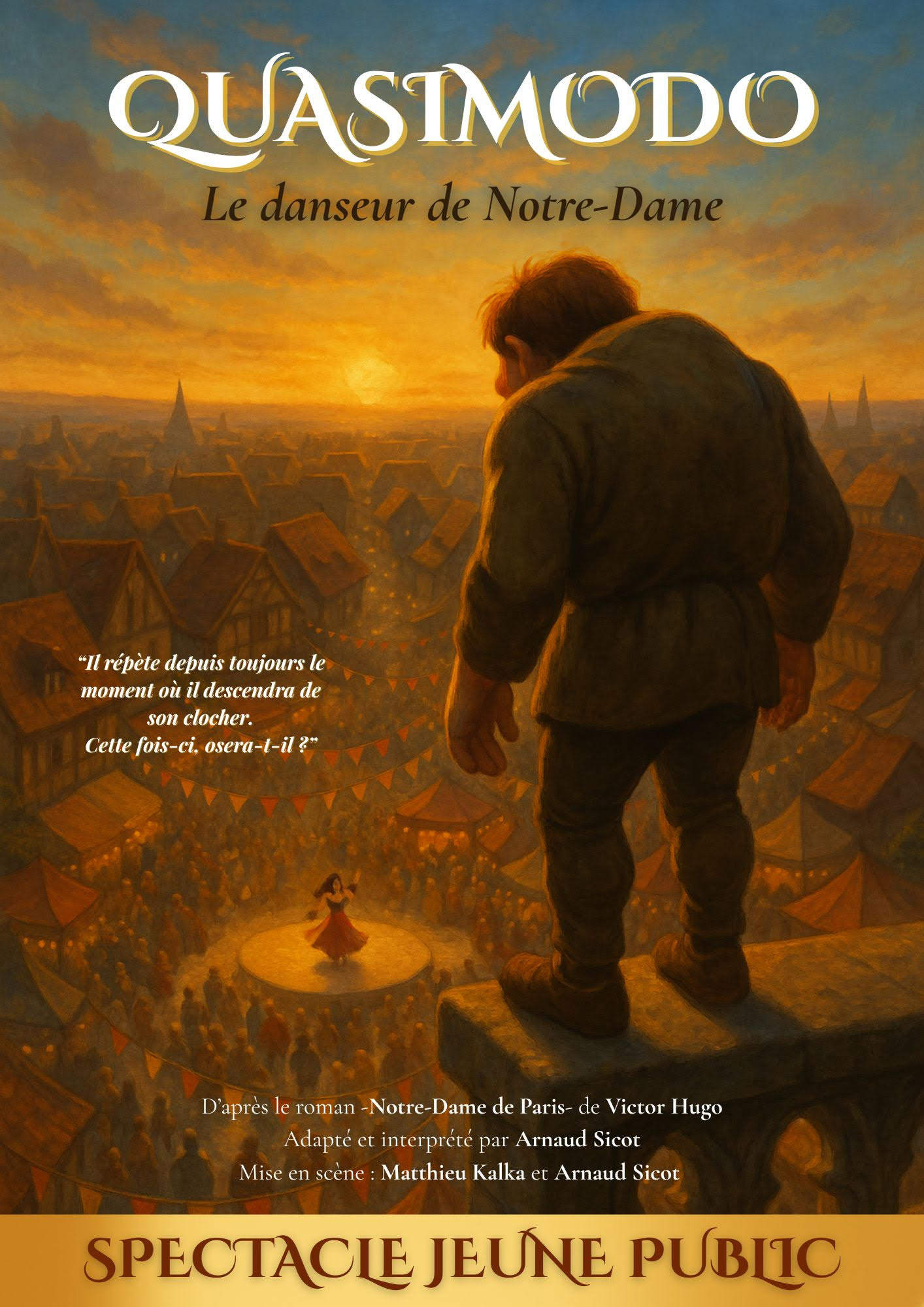 Comme chaque année il répète en secret " le grand moment " où il descendra à la Fête des Cloches pour participer au concours de danse... Il s'entraîne seul, en pensant à Esmeralda pour se donner du courage. Mais dans sa tête résonne la voix de Frollo son maître : "Tu es monstrueux... Tu n'es bon qu'à sonner les cloches... Reste en haut, en bas on se moquera de toi."
